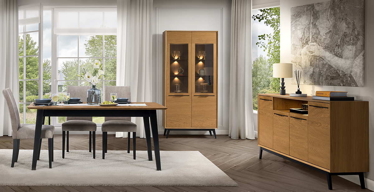 Farmecul nobil al lemnului este accentuat de mânere metalice delicate, făcând ca mobilierul din această linie să fie atrăgător și captivant.