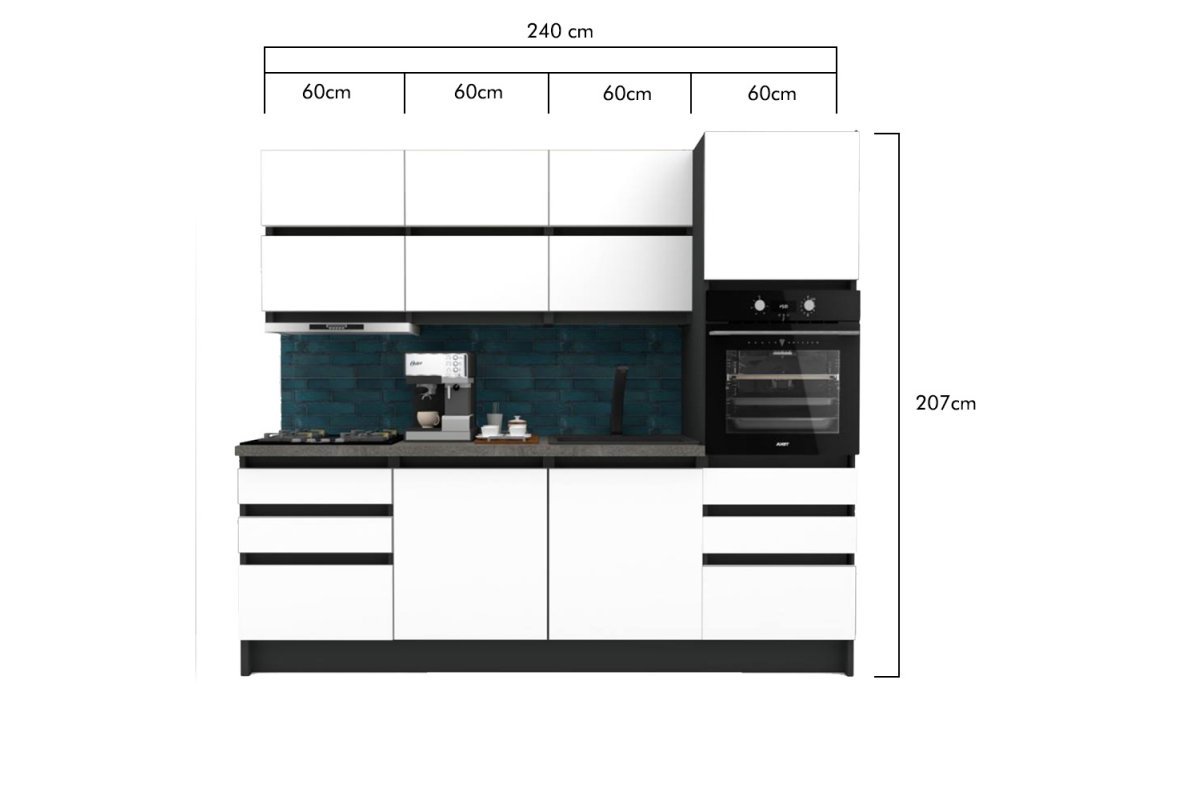 Dimensiuni | Setul are lungimea de 240 cm si cuprinde 7 module care pot fi dispuse independent: 1) Corpuri superioare ( L x H x A): - 2 x corp superior cu doua usi cu deschidere verticala: 60 x 72 x 32 cm; - 1 x corp de hota superior cu doua usi cu deschidere verticala: 60 x 72 x 32 cm; 2) Corpuri inferioare ( L x H x A): - 1 x masca chiuveta : 60 x 82 x 52 cm; - 1 x dulap inferior cu o usa: 60 x 82 x 52 cm; - 1 x corp pentru plita incorporabila cu trei sertare: 60 x 82 x 60 cm; 4) Blaturi (L x H x Ad): - 1 x blat nedecupat pentru corpurile inferioare: 180 x 3,8 x 60 cm. Dimensiuni (set din foto) ( L x h x A): 240 x 207 x 60 cm. Decuparea blatului pentru incorporarea plitei si chiuvetei se face de catre client. Electrocasnicele din fotografii nu intra in calculatia produsului. Culoare set: - Corpuri: 0164; - Fronturi: decor PAL 0244; - Blat termorezistent: 4299. |