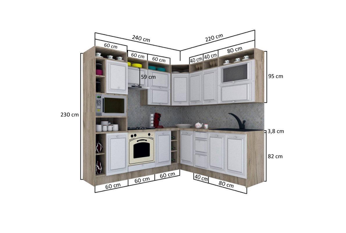| Dimensiuni | Daca spatiul unde vreti sa organizati bucataria va permite o amenajare de colt, propunerea noastra este: Bucataria LEEA ART CORNER FRONT MDF CANYON 220-240 ST. K002 / decor 264. Setul are lungimea de 240 cm stanga si 220 cm dreapta si cuprinde 13 module care pot fi dispuse independent. 1) Corpuri superioare ( L x H x A): - 1 x corp superior cu 2 usi cu deschidere verticala si raft deschis: 80 x 95 x 32 cm; - 2 x corp superior cu o usa de 72 cm si raft deschis: 40 x 95 x 32 cm; - 1 x corp suprapozabil de colt: 60 x 95 x 60 cm; - 1 x corp superior cu 2 usi cu deschidere verticala si raft deschis: 60 x 95 x 32 cm; - 1 x corp suprapozabil hota: 60 x 59 x 32 cm; 2) Corpuri inferioare ( L x H x A): - 1 x masca chiuveta: 80 x 82 x 52 cm; - 1 x dulap inferior cu 3 sertare: 40 x 82 x 52 cm; - 1 x dulap inferior de colt: 100 x 82 x 52 cm; - 1 x raft deschis: 20 x 82 x 50 cm; - 1 x dulap inferior cu 1 usa: 40 x 82 x 52 cm; - 1 x corp pentru cuptor incorporabil: 60 x 82 x 52 cm; 3) Corp Inalt DP_60/230 fr_1x570/396 si fr_1x713/396: 60 x 230 x 58 cm - 1 bucata; 4) Blaturi (L x H x Ad): - 1 x blat nedecupat pentru corpurile inferioare: 220 x 3,8 x 60 cm; - 1 x blat nedecupat pentru corpurile inferioare: 120 x 3,8 x 60 cm. Dimensiuni (set din foto) ( L x h x A): 220-240 x 230 x 60 cm. Decuparea blatului pentru incorporarea plitei si chiuvetei se face de catre client. |