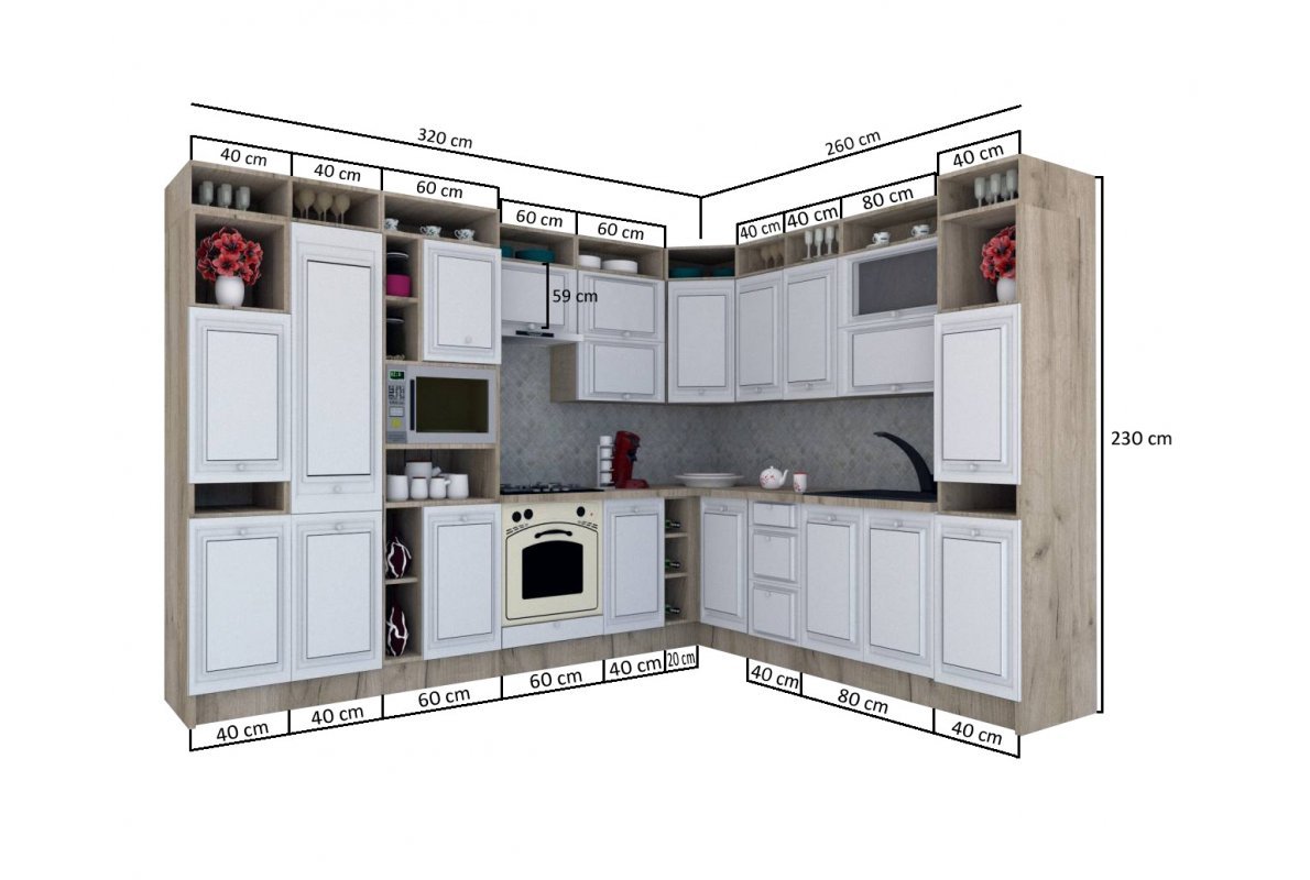 Dimensiuni | Daca spatiul unde vreti sa organizati bucataria va permite o amenajare de colt, propunerea noastra este: Bucataria LEEA ART CORNER FRONT MDF PARMA 260-320 ST. K002 / decor 246 Setul are lungimea de 320 cm stanga si 260 cm dreapta si cuprinde 16 module care pot fi dispuse independent. 1) Corpuri superioare ( L x H x A): - 1 x corp superior cu 2 usi cu deschidere verticala si raft deschis: 80 x 95 x 32 cm; - 2 x corp superior cu o usa de 72 cm si raft deschis: 40 x 95 x 32 cm; - 1 x corp suprapozabil de colt: 60 x 95 x 60 cm; - 1 x corp superior cu 2 usi cu deschidere verticala si raft deschis: 60 x 95 x 32 cm; - 1 x corp suprapozabil hota: 60 x 59 x 32 cm; 2) Corpuri inferioare ( L x H x A): - 1 x masca chiuveta: 80 x 82 x 52 cm; - 1 x dulap inferior cu 3 sertare: 40 x 82 x 52 cm; - 1 x dulap inferior de colt: 100 x 82 x 52 cm; - 1 x raft deschis: 20 x 82 x 50 cm; - 1 x dulap inferior cu 1 usa: 40 x 82 x 52 cm; - 1 x corp pentru cuptor incorporabil: 60 x 82 x 52 cm; 3) Corp Inalt DP_60/230 fr_1x570/396 si fr_1x713/396: 60 x 230 x 58 cm - 1 bucata; 4) Corp Inalt DC_40/230 fr_1x713/396 si fr_1x1247/396: 40 x 230 x 58 cm - 1 bucata; 5) Corp Inalt DC_40/230 fr_2x713/396: 40 x 230 x 58 cm - 2 bucati; 6) Blaturi (L x H x Ad): - 1 x blat nedecupat pentru corpurile inferioare: 220 x 3,8 x 60 cm; - 1 x blat nedecupat pentru corpurile inferioare: 120 x 3,8 x 60 cm. Dimensiuni (set din foto) ( L x h x A): 260-320 x 230 x 60 cm. Decuparea blatului pentru incorporarea plitei si chiuvetei se face de catre client. |
