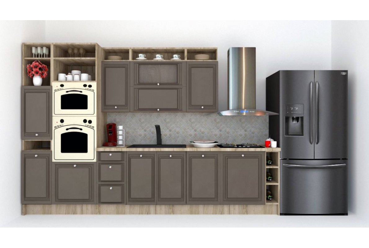 | Materiale folosite | - fronturile sunt realizate din MDF cu grosimea de 16 mm; - carcase realizate din PAL; - blat termorezistent nedecupat cu grosimea de 38 mm pentru corpurile inferioare; - decuparea blatului pentru incorporarea plitei si chiuvetei se face de catre client. |
