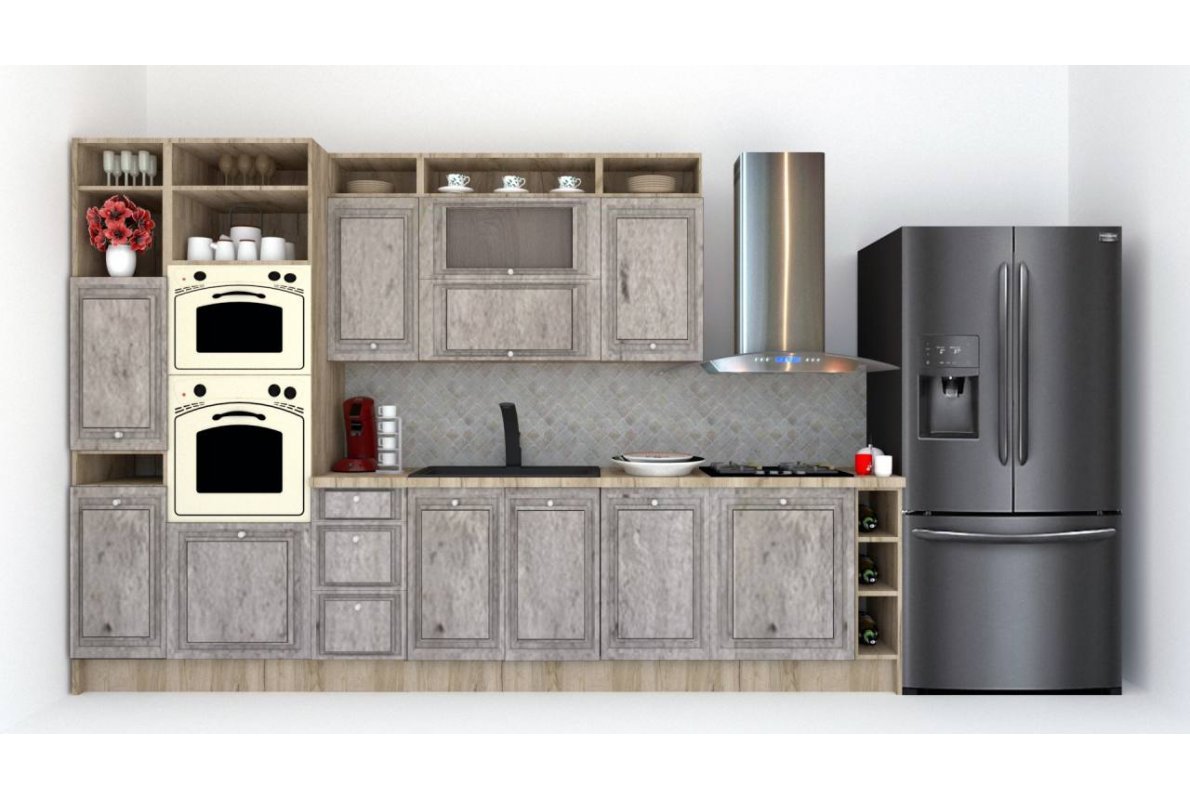 Daca spatiul unde vreti sa organizati bucataria are un perete de 340 cm propunerea noastra este: Bucataria  LEEA ART FRONT MDF FRESCO 340A.