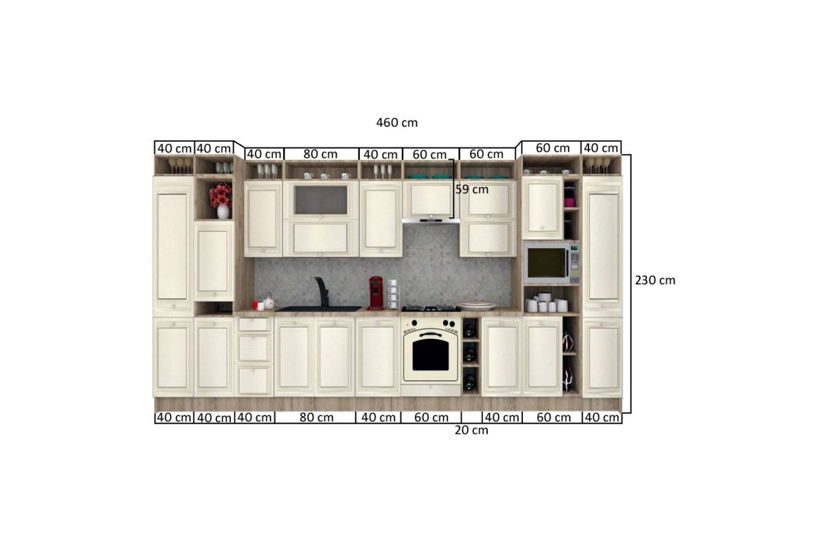 Dimensiuni | Daca spatiul unde vreti sa organizati bucataria are un perete de 460 cm propunerea noastra este: Bucataria LEEA ART FRONT MDF PARMA 460A K002 / decor 267. Setul are lungimea de 460 cm si cuprinde 15 module care pot fi dispuse independent. 1) Corpuri superioare ( L x H x A): - 2 x corp superior cu o usa de 72 cm si raft deschis: 40 x 95 x 32 cm; - 1 x corp superior cu 2 usi cu deschidere verticala si raft deschis: 80 x 95 x 32 cm; - 1 x corp suprapozabil hota: 60 x 59 x 32 cm; - 1 x corp superior cu 2 usi cu deschidere verticala si raft deschis: 60 x 95 x 32 cm; 2) Corpuri inferioare ( L x H x A): - 1 x dulap inferior cu 3 sertare: 40 x 82 x 52 cm; - 1 x masca chiuveta: 80 x 82 x 52 cm; - 1 x dulap inferior cu 1 usa: 40 x 82 x 52 cm; - 1 x corp pentru cuptor incorporabil: 60 x 82 x 52 cm; - 1 x raft deschis: 20 x 82 x 50 cm; - 1 x dulap inferior cu 1 usa: 40 x 82 x 52 cm; 3) Corp Inalt DP_60/230 fr_1x570/396 si fr_1x713/396: 60 x 230 x 58 cm - 1 bucata; 4) Corp Inalt DC_40/230 fr_1x713/396 si fr_1x1247/396: 40 x 230 x 58 cm - 2 bucati; 5) Corp Inalt DC_40/230 fr_2x713/396: 40 x 230 x 58 cm - 1 bucata; 6) Blaturi (L x H x Ad): - 1 x blat nedecupat pentru corpurile inferioare: 280 x 3,8 x 60 cm. Dimensiuni (set din foto) ( L x h x A): 460 x 230 x 60 cm. Decuparea blatului pentru incorporarea plitei si chiuvetei se face de catre client. |