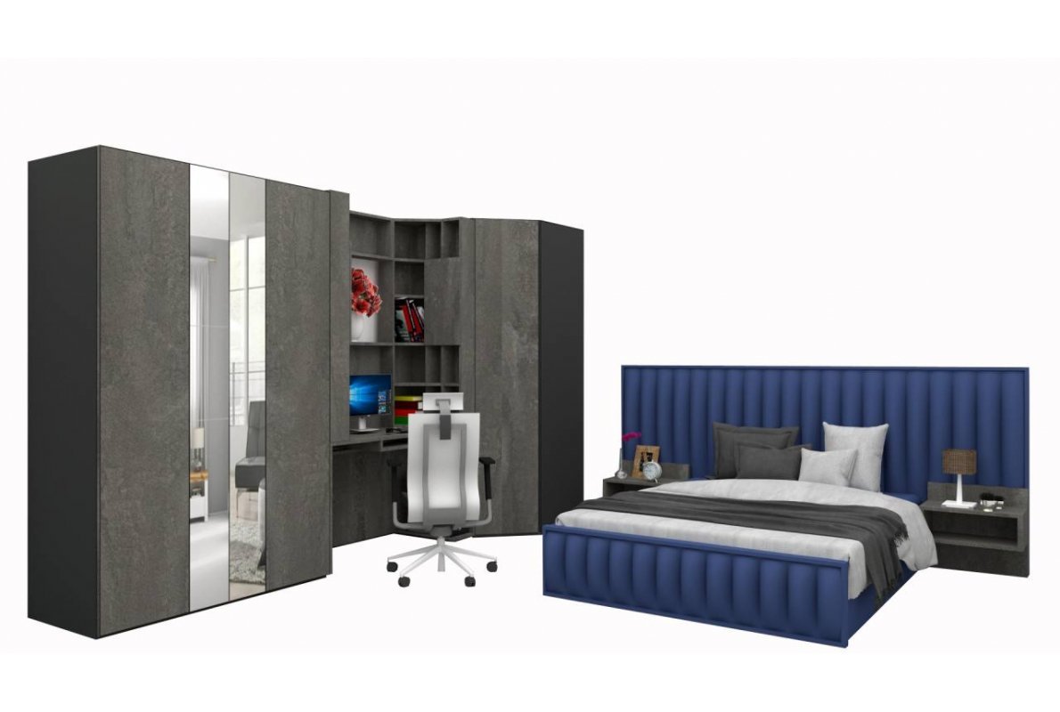 Componenta set | Setul contine: 2 x Dulap cu 2 usi - Latime:75 cm, Adancime: 66 cm, Inaltime:218 cm, 1 x Ansamblu birou 1 x Dulap de colt - Latime: 103-103 cm, Adancime: 66 cm, Inaltime: 218 cm, 1 x Pat tapitat - Latime capat mare: 294 cm, Latime capat mic: 173.6 cm, Latime pat: 171 cm, Inaltime capat mare: 127 cm, Inaltime pat: 40 cm, Lungime pat: 217 cm, 2 x Noptiera - Latime 58,5 cm, Inaltime 45,5 cm, Adancime: 40 cm |