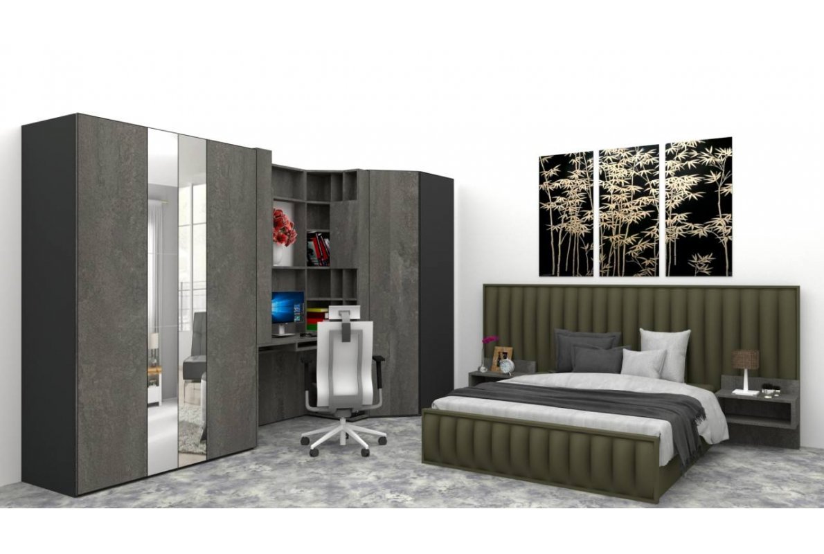 Componenta set | Setul contine: 2 x Dulap cu 2 usi - Latime:75 cm, Adancime: 66 cm, Inaltime:240 cm, 1 x Ansamblu birou: - Latime: 143 cm, Adancime: 66 cm, Inaltime 240 cm, 1 x Dulap de colt - Latime: 103-103 cm, Adancime: 66 cm, Inaltime: 240 cm, 1 x Pat tapitat - Latime capat mare: 294 cm, Latime capat mic: 173.6 cm, Latime pat: 171 cm, Inaltime capat mare: 127 cm, Inaltime pat: 40 cm, Lungime pat: 217 cm, 2 x Noptiera - Latime 58,5 cm, Inaltime 45,5 cm, Adancime: 40 cm |