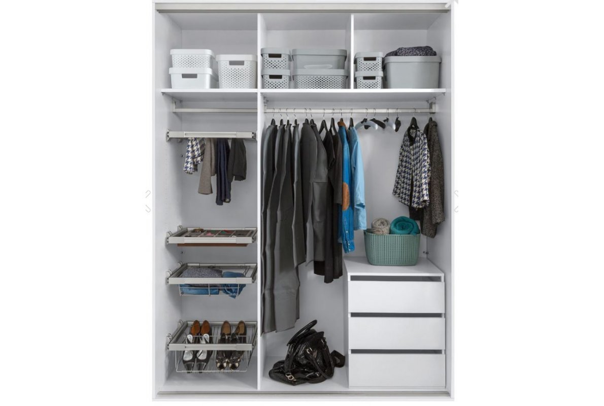 Pentru un dulap mai functional, il poti dota cu un organizator, cos de rufe, cos pentru incaltaminte, bare metalice cu iluminare LED pentru umerase, suport pentru pantaloni si cravate.