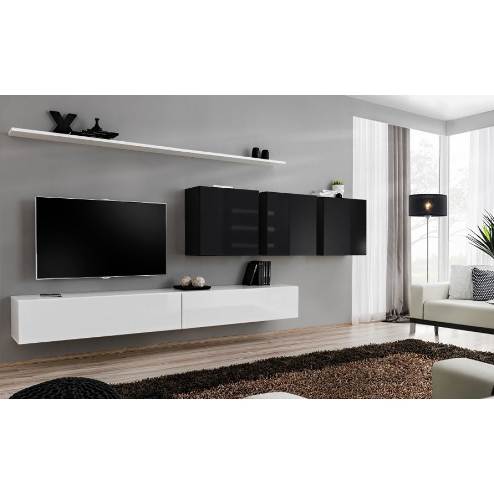 | De ce sa alegi acest produs ? | - Elementele se prind in perete; - Pot fi aranjate independent, in functie de necesitatile individuale; - Comoda TV are doua spatii de depozitare; - Raftul suspendat are doua spatii de depozitare; - Polite ideale pentru asezarea obiectelor decorative; - Spatiu generos pentru obiectele necesare; - Corpuri: alb mat si negru mat; - Fronturi: alb lucios si negru lucios. |